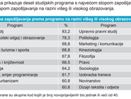 S druge strane, studiji poput prava (40,4%), sociologije (40%), novinarstva (37,1%), filozofije (41,6%) ili politologije (43,8%) bilježe niže stope zapošljavanja. To ne znači da za njih nema mjesta na tržištu rada, ali put do zaposlenja često uključuje dodatna usavršavanja, specijalizacije ili dulje razdoblje traženja posla.